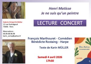 Henri Matisse, Je ne suis qu’un peintre (texte de Karin Müller). Lecture-concert par le comédien François Marthouret accompagné par la harpiste Bénédicte Rostaing.